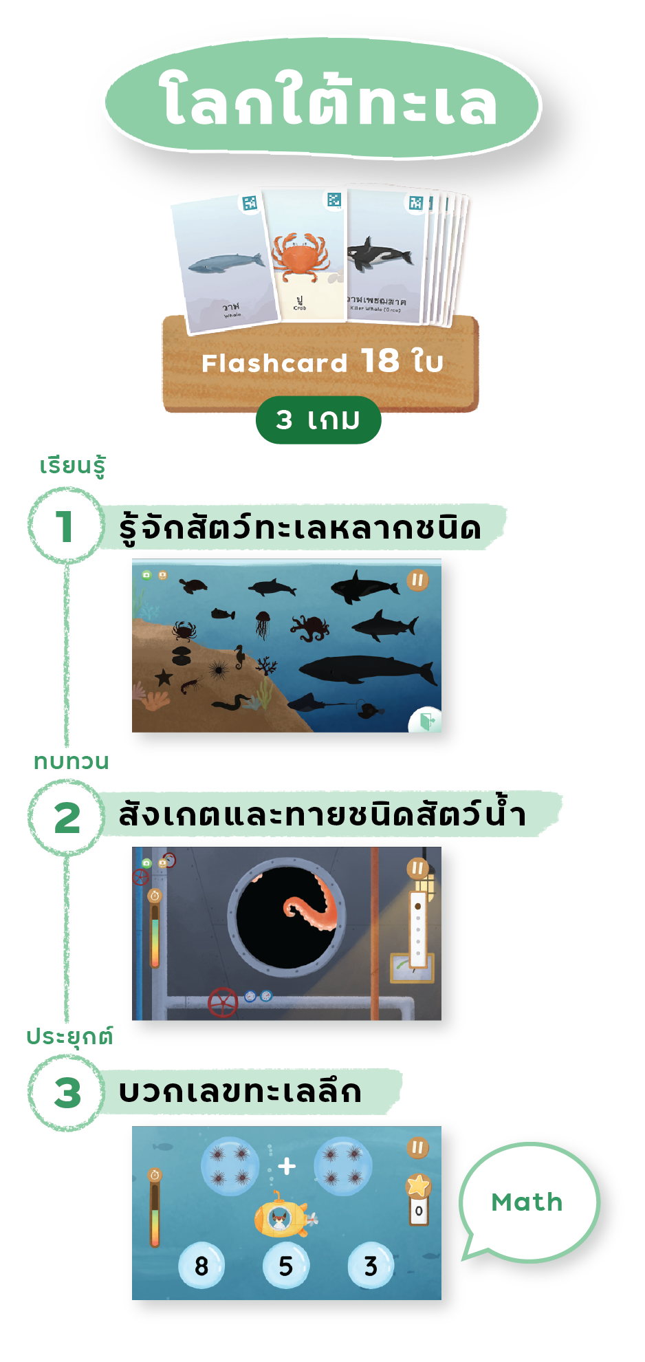 ฝึกทักษะสังเกตจากเกมทายสัตว์น้ำที่ว่ายน้ำผ่านเรือดำน้ำไป